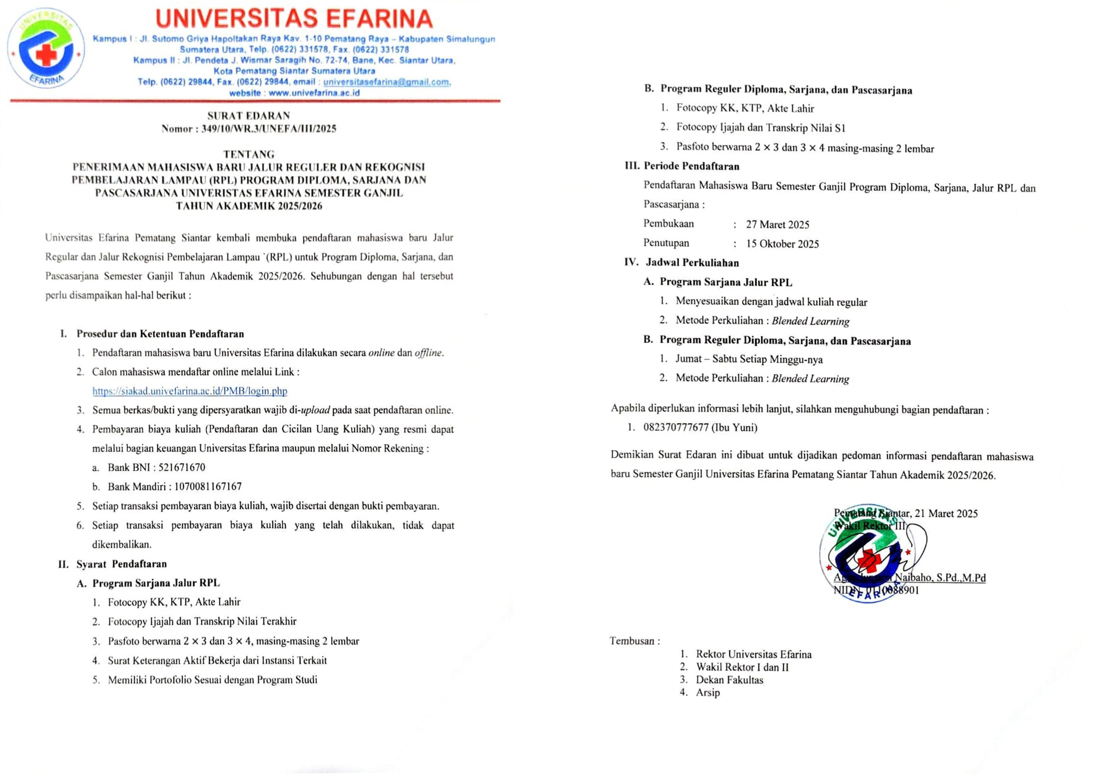 Universitas Efarina satu satunya Universitas Swasta dengan Fakultas Kesehatan di Kabupaten Simalungun